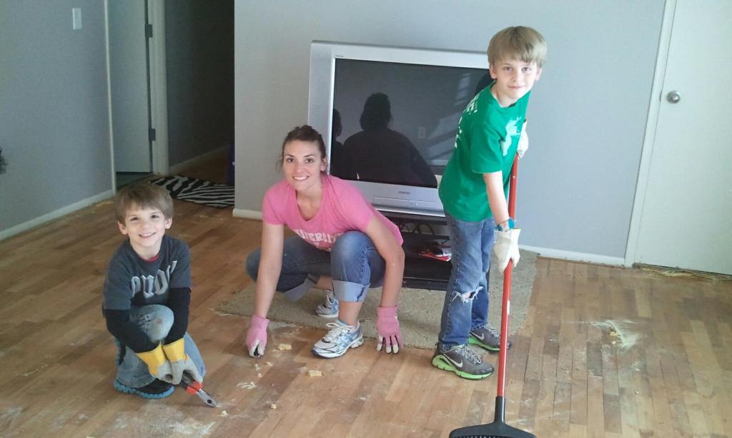 Now both Heather and I knew what to do. We had watched several youtube videos. The guy at the rental store even told us what to expect. That makes us experts, right? Well, even if we both understood what should happen, it didn’t prepare us for what happened next. We removed all the carpet, tarped all the hallways and doorways etc. The rooms were empty. The house was prepared and there we stood waiting for the next move. We prepared the machines and I stood in the middle of the living room ready to begin. As I started the sander and began the process, I looked over in time to watch my wife walk out of the house. Even though we both expected it to be loud and messy, she needed a few moments to brace herself.